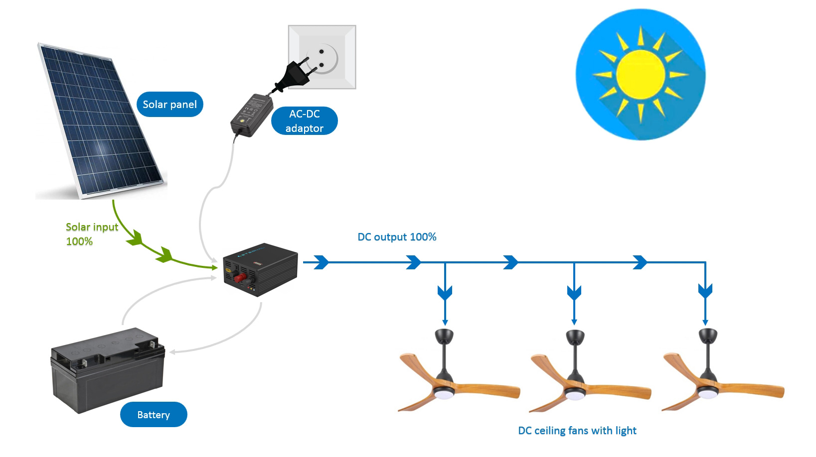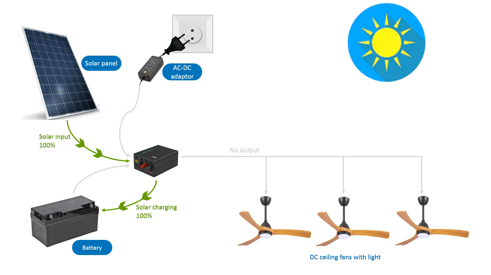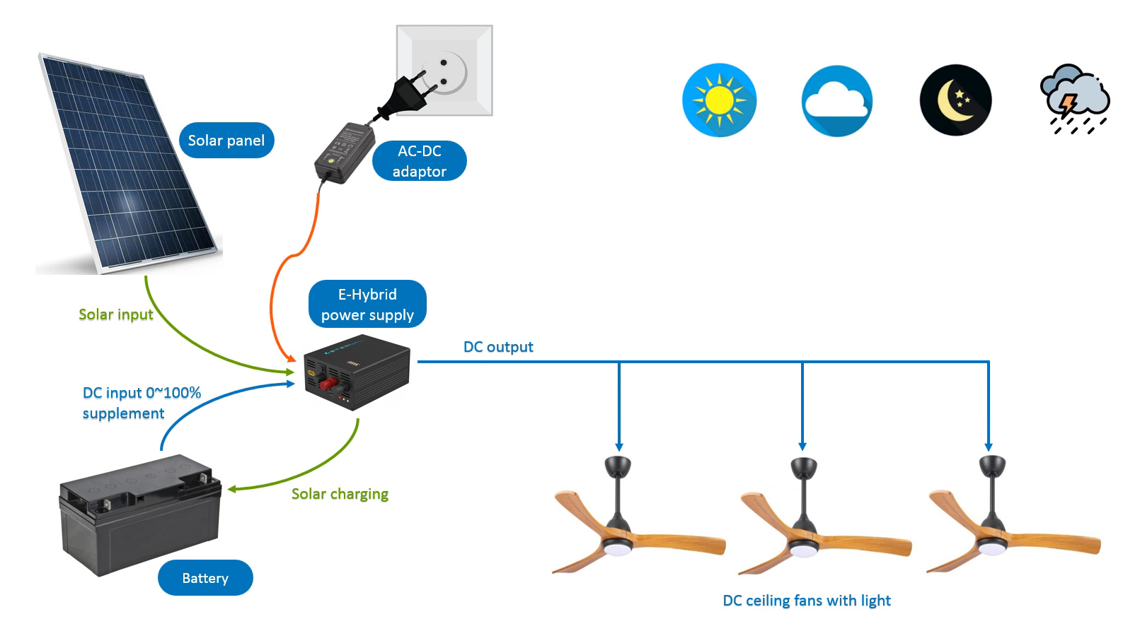 Der E-Hybrid Solar-Deckenventilator ist ein netzunabhängiges System, besteht aus Solarpanel, E-Hybrid DC-DC-Solarstromregler, Deckenventilatoren mit 24V BLDC-Motor, Batterien. Es ermöglicht den 24 -V -Solarenergieeingang, 24V Batterieeingang, und 24VDC-Eingang aus dem AC-DC-Adapter.
