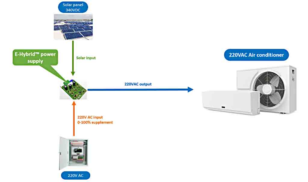 The core of the E-Hybrid solar air conditioner is the E-Hybrid AC/DC coupling power supply. It is integrated inside the air conditioner and can handle both solar DC input and standard 220VAC grid electricity input.