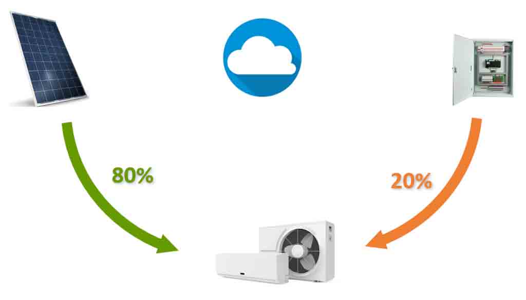 - Solar power directly supplies the air conditioner. When solar energy is insufficient, the system switches to grid electricity.