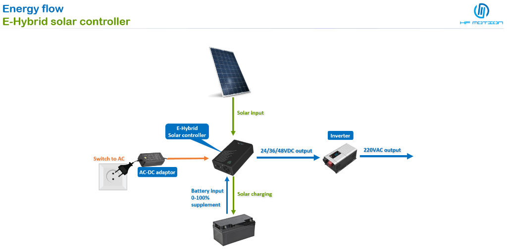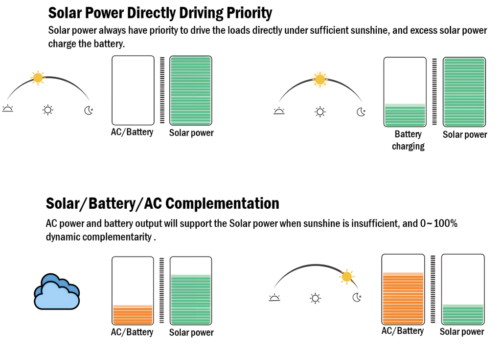 - When solar power is lower than the loads, solar power & battery/AC power will drive the loads in a parallel mode. Battery/AC power supplement the missing solar power in a dynamic mode, to form a stable output power, and relevant to the loading power.