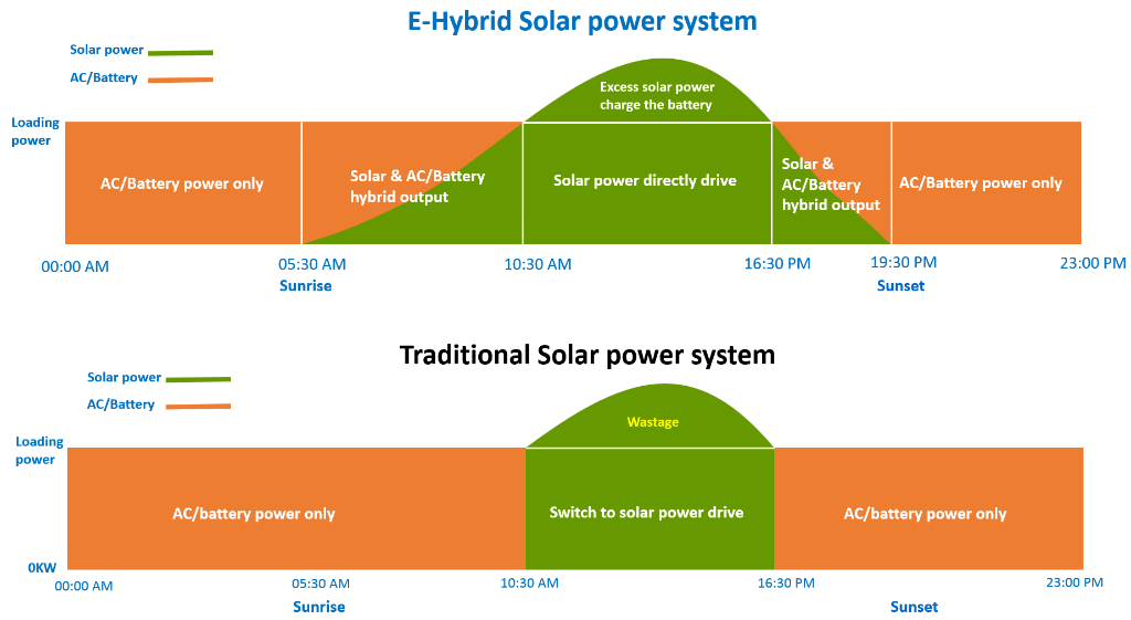Application and Energy Flow of E-hybrid Solar Power System VS Normal System