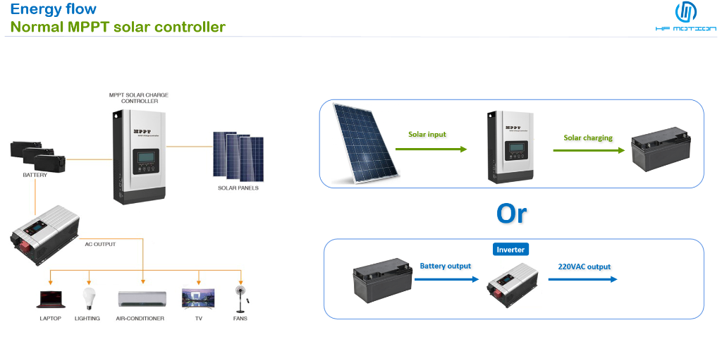 - When solar power is higher than loads, solar power drive the loads directly, and excess solar power charger the battery in the same time.