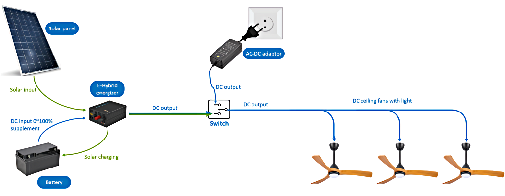 Cuando la luz del sol es suficiente, La energía solar generalmente impulsa directamente los ventiladores.. Cualquier energía solar adicional carga la batería.. La mayor parte de la energía solar no pasa a través de la batería..