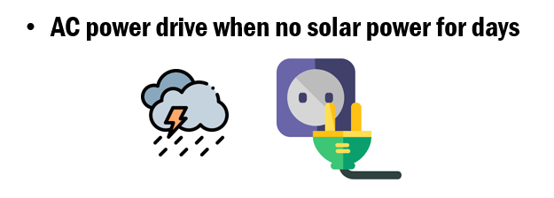 En el modo de conducción híbrido real, las cargas pueden utilizar energía solar incluso si es tan baja como 1w. Esto permite 30% Mayor utilización de energía solar en comparación con otros sistemas de ventiladores solares..