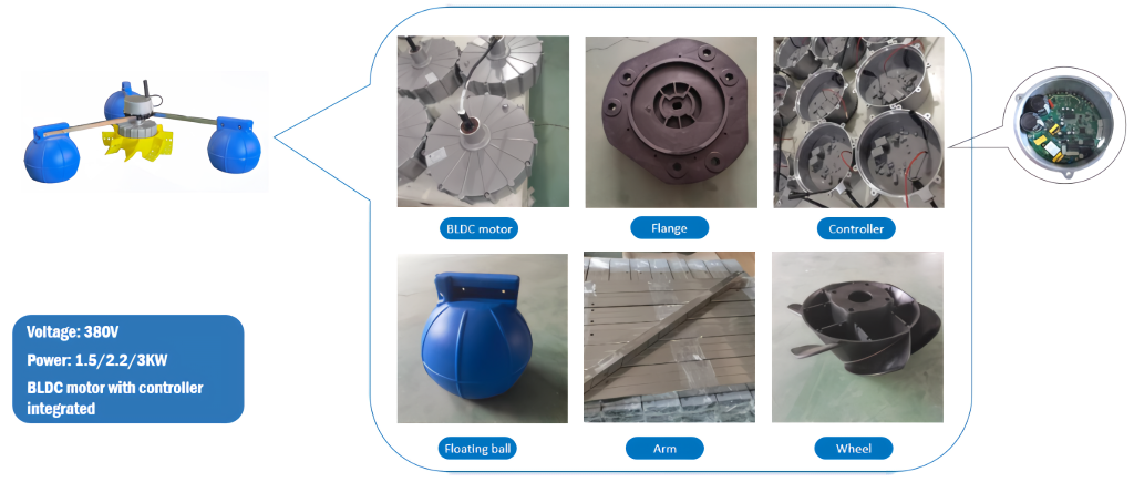 Este tipo de sistema aireador consta de paneles solares., Suministro de energía E-Híbrido (incluyendo módulo MPPT), Motor BLDC y controlador, impulso, bola flotante y soporte. Proporcionamos sistemas de productos completos y accesorios de soporte..