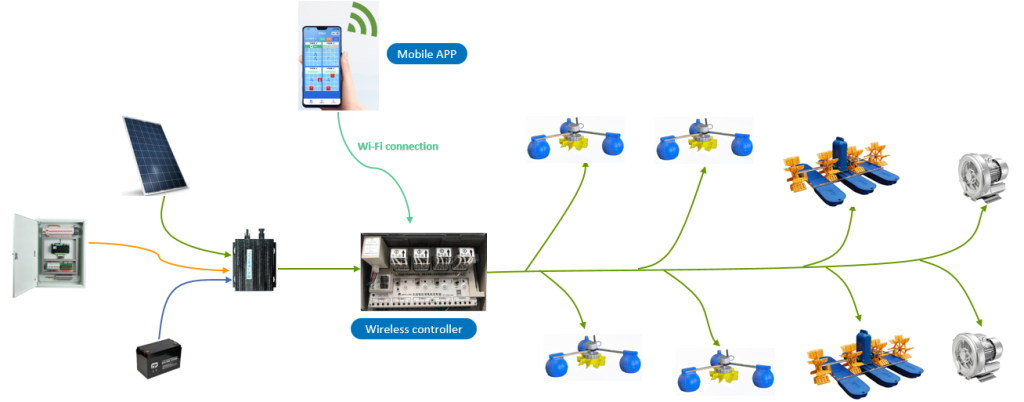 Este sistema también se puede utilizar con el sistema de aplicación móvil para lograr el control remoto, Gestión de múltiples estanques de peces y aireadores., regulación de velocidad continua, Monitoreo del estado de funcionamiento del aireador., Monitoreo del contenido de oxígeno del agua y de la temperatura del agua., haciendo la acuicultura más fácil, y con menores costos operativos.