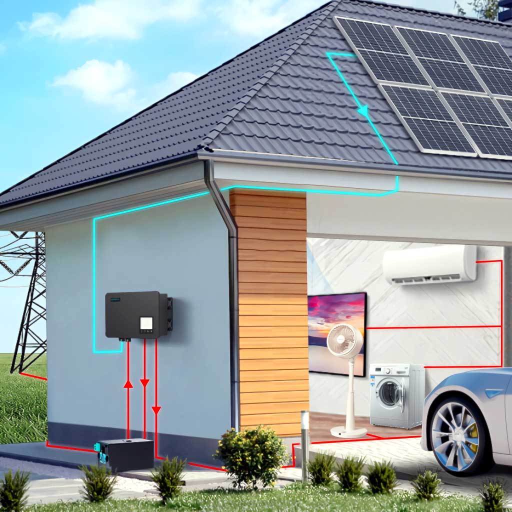 Cuando la luz del sol es baja, Las baterías o la energía de la red complementan automáticamente la entrada solar para garantizar un suministro de energía estable..