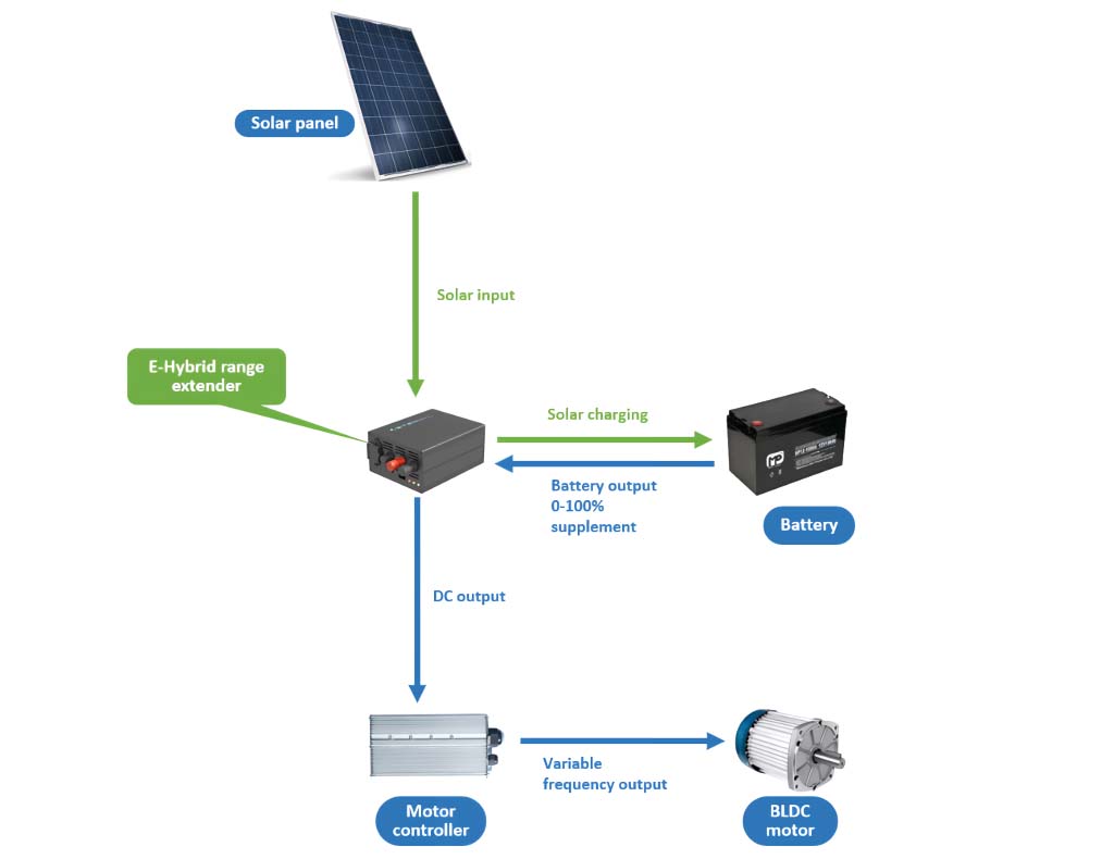 E-Hybrid solar range extender is easy to use by plug in with the motor controller and battery. The user can use with the local solar panel and battery with the suggested parameters. And also can source the solar panel and battery from us.
