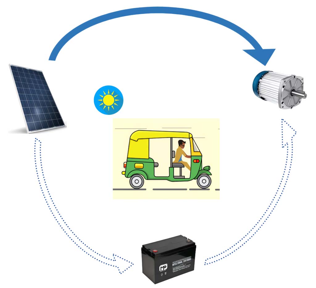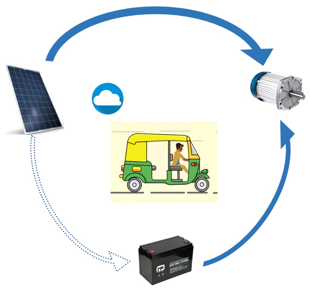On sunny days, when the e-rickshaw is stopped, solar energy charges the battery only.
